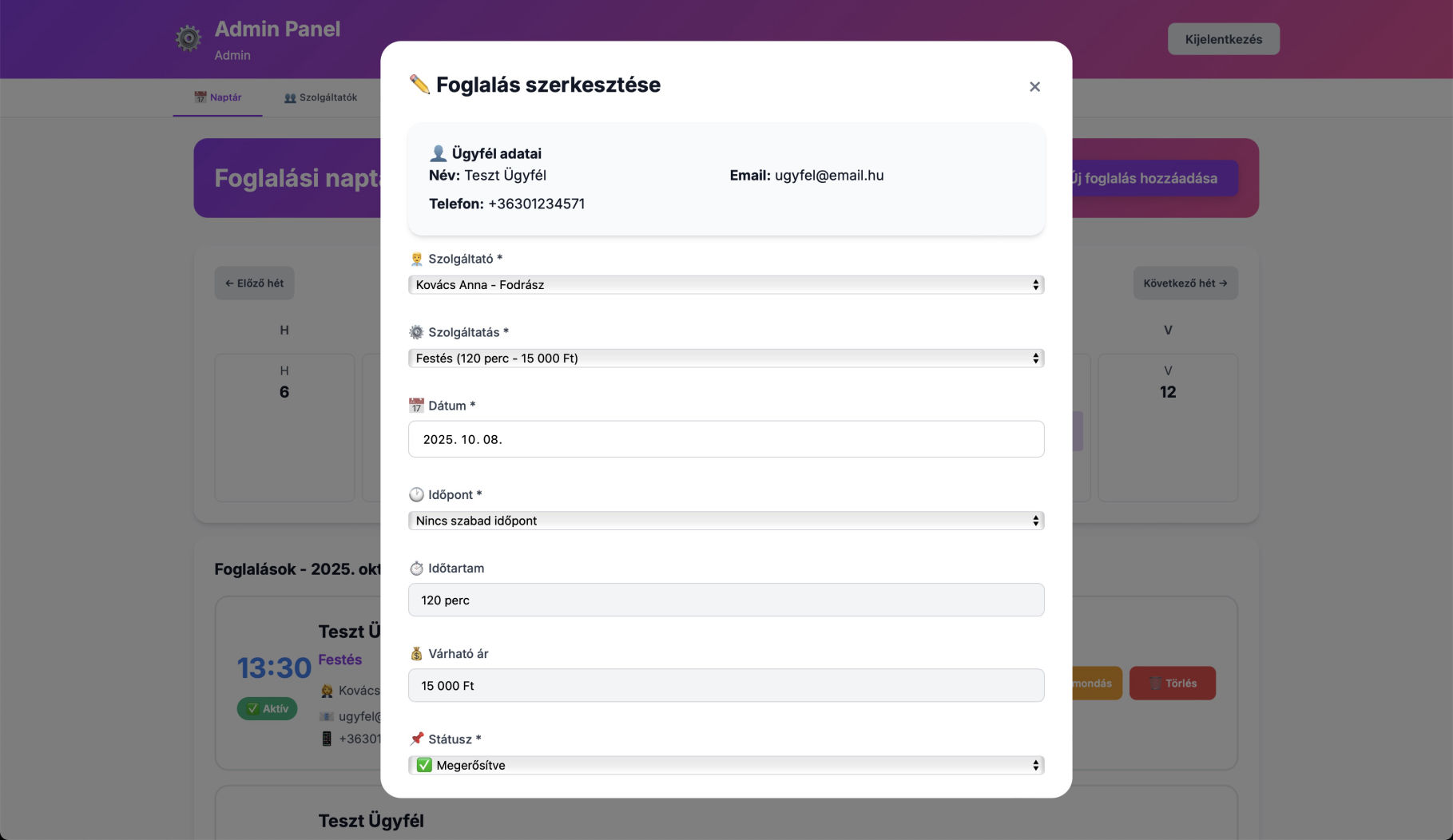 A szalon tulajdonosa teljes körű hozzáféréssel rendelkezik minden foglaláshoz és beállításhoz: ellenőrizheti a naptárakat, módosíthat időpontokat, szolgáltatásokat és szakembereket, így a működés rugalmasan és átláthatóan irányítható.