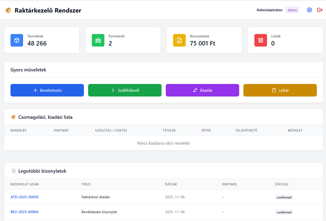 Minden művelet dokumentált, így pontosan látható, hogy melyik termékből hol, mekkora mennyiség található. A rendszer különféle kimutatásokkal támogatja a raktáros és a vezetői munkát is.