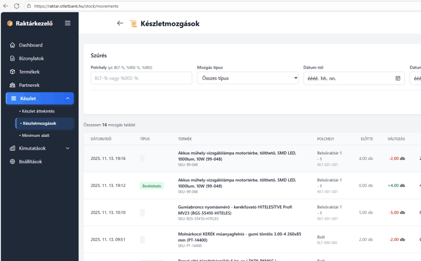 A termék kiválasztása után megadható a polchely, a mennyiség és szükség esetén az ár. A rendszer négy fő mozgástípust támogat: