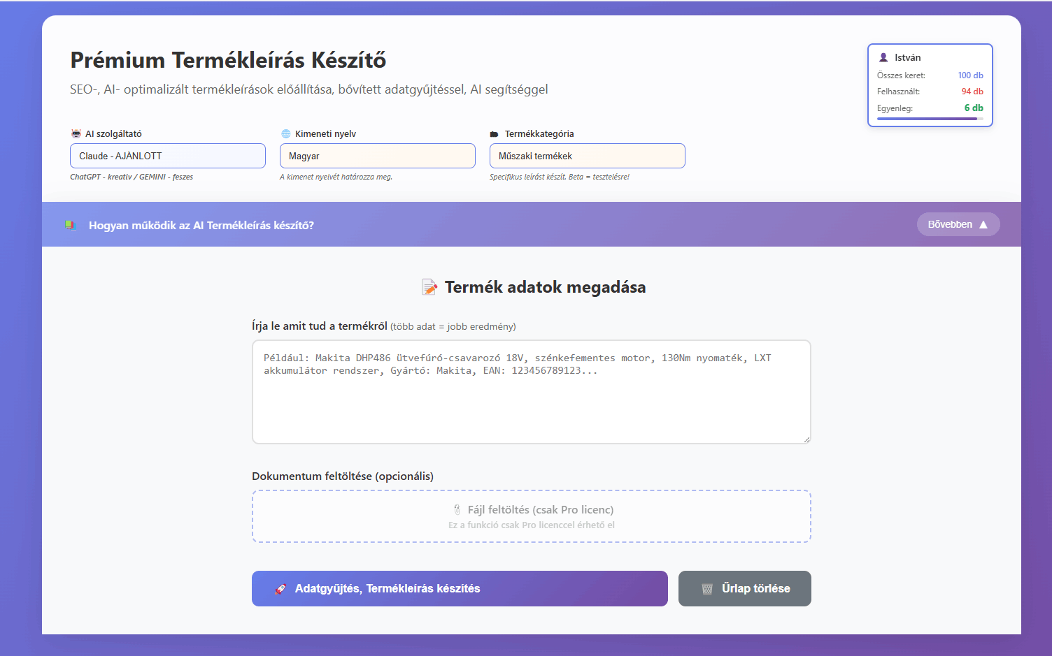 Előfizetéses AI/LLM szolgáltatásunkkal egyedi, SEO és AI optimalizált termékleírásokat készíthetsz, amelyek növelik az eladásaidat.