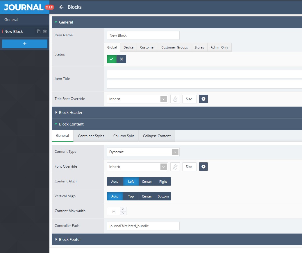 A Journal3 bármely moduljában alkalamazható ahol dynamic content választható. Például a Modules → Blocks. Hozz létre egy blokkot amit majd később felhasználsz.