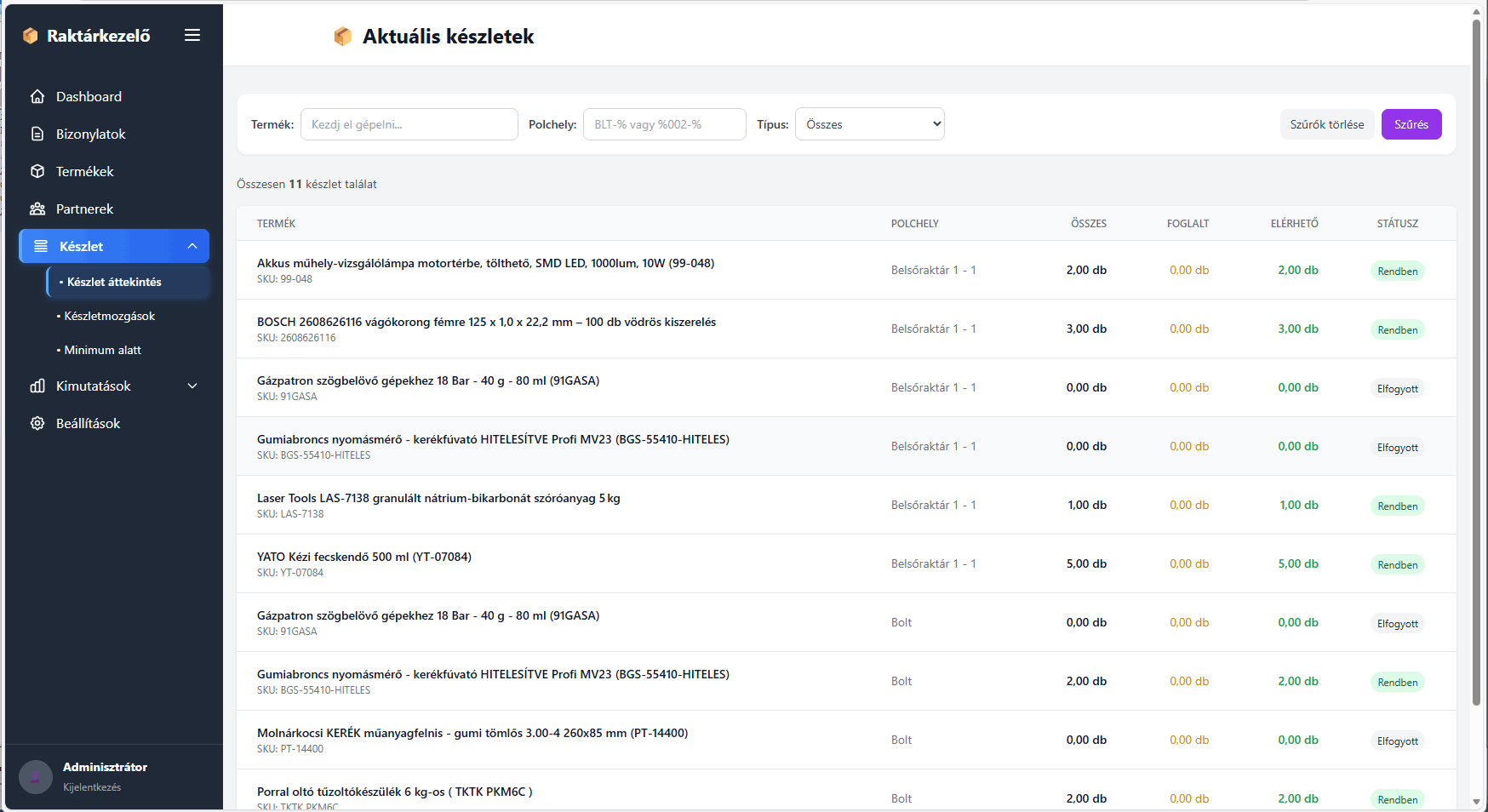 Minden művelet dokumentált, így pontosan látható, hogy melyik termékből hol, mekkora mennyiség található. A rendszer különféle kimutatásokkal támogatja a raktáros és a vezetői munkát is.